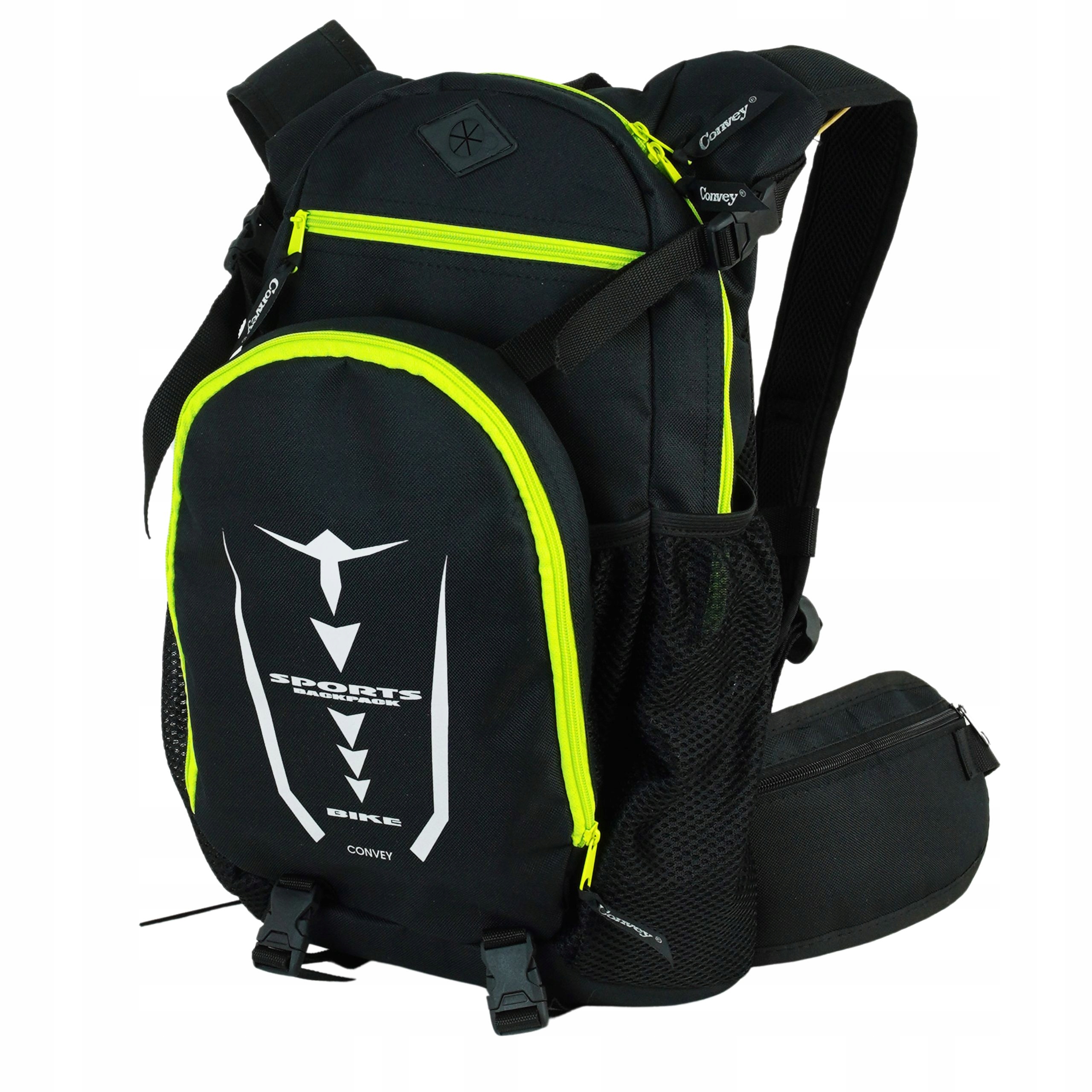 Plecak oferuje wiele praktycznych rozwiązań, takich jak boczne kieszenie siatkowe na bidon, kieszeń na kask lub piłkę oraz dwie kieszonki na pasie biodrowym. Z przodu znajduje się kieszonka na zamek, a także wyjście na bukłak, co czyni go idealnym dla rowerzystów.
