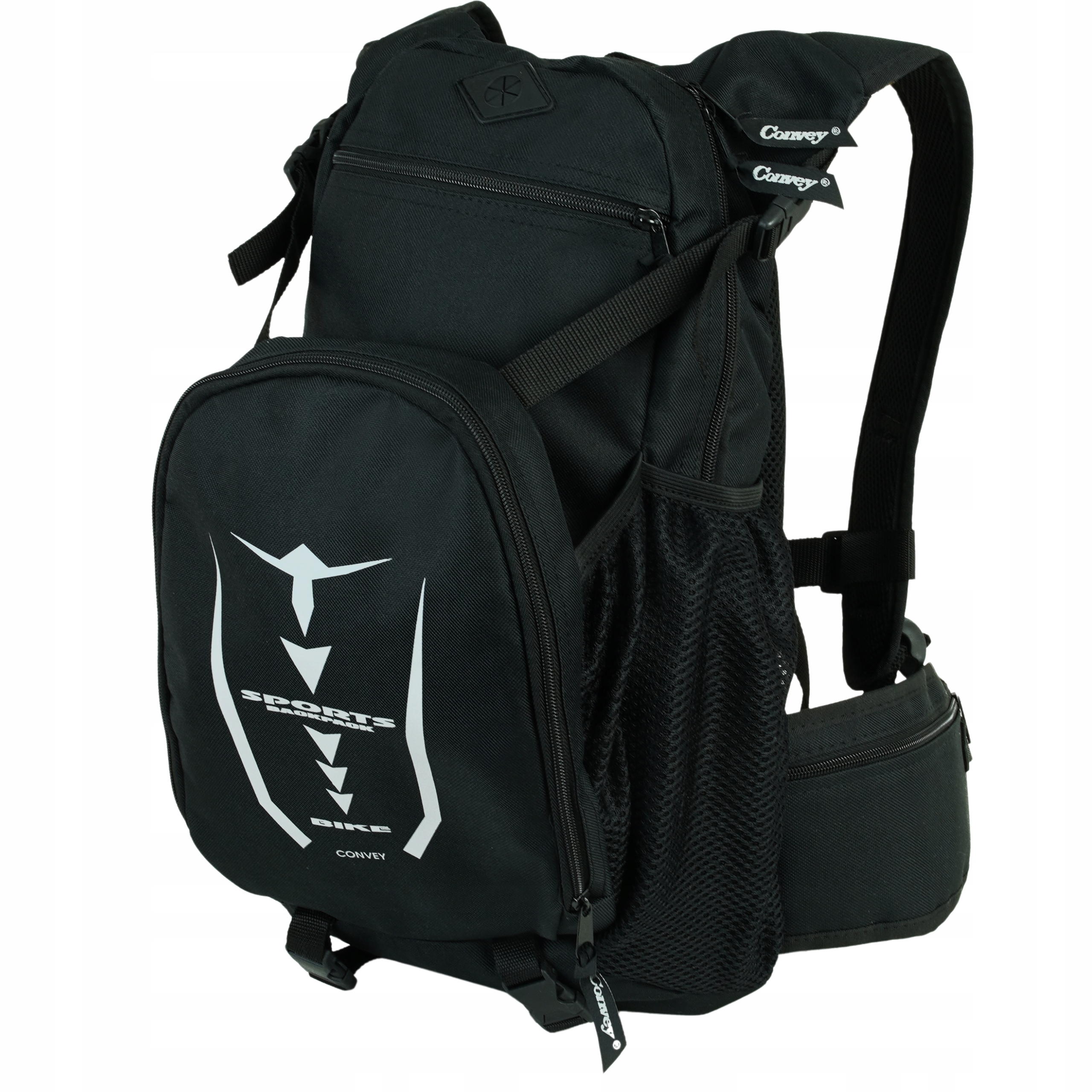 Plecak oferuje wiele praktycznych rozwiązań, takich jak boczne kieszenie siatkowe na bidon, kieszeń na kask lub piłkę oraz dwie kieszonki na pasie biodrowym. Z przodu znajduje się kieszonka na zamek, a także wyjście na bukłak, co czyni go idealnym dla rowerzystów.